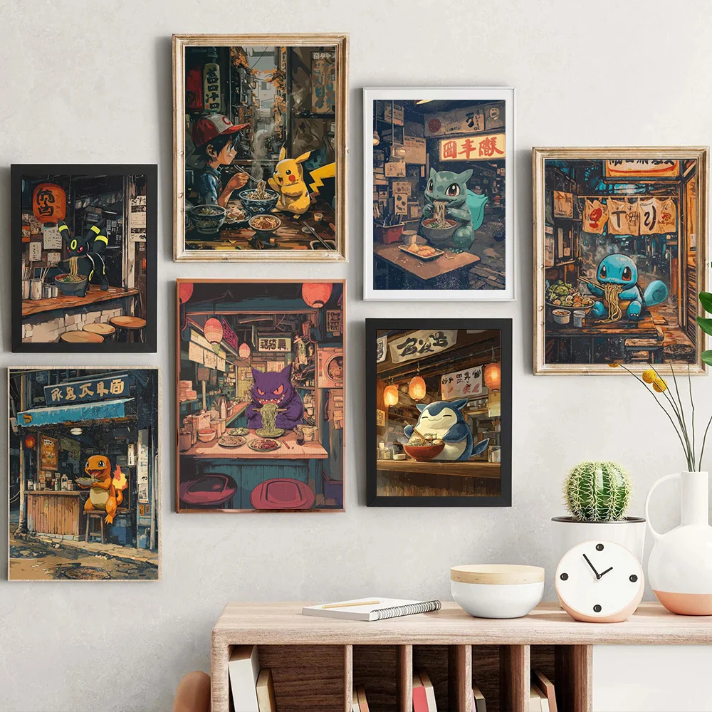 P-Pokemon Japanese Anime Canvas Painting Kawaii Elf Pets HD Poster Retro Bar Noodle Room Living Room Home Mural Decor Kids Gifts