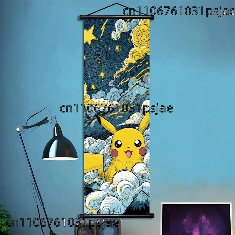 Pokémon Scroll Art Cloth Bulbasaur Pikachu Charmander Starry Night Style Cartoon Wall Hanging Poster Home Collection & Gifts